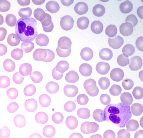 Peripheral blood film with two PHA neutrophils pictured, note their non-round appearance with bilobed “pince-nez” nuclei. Image by Guy Waterval - Own work, Apache License 2.0, Link