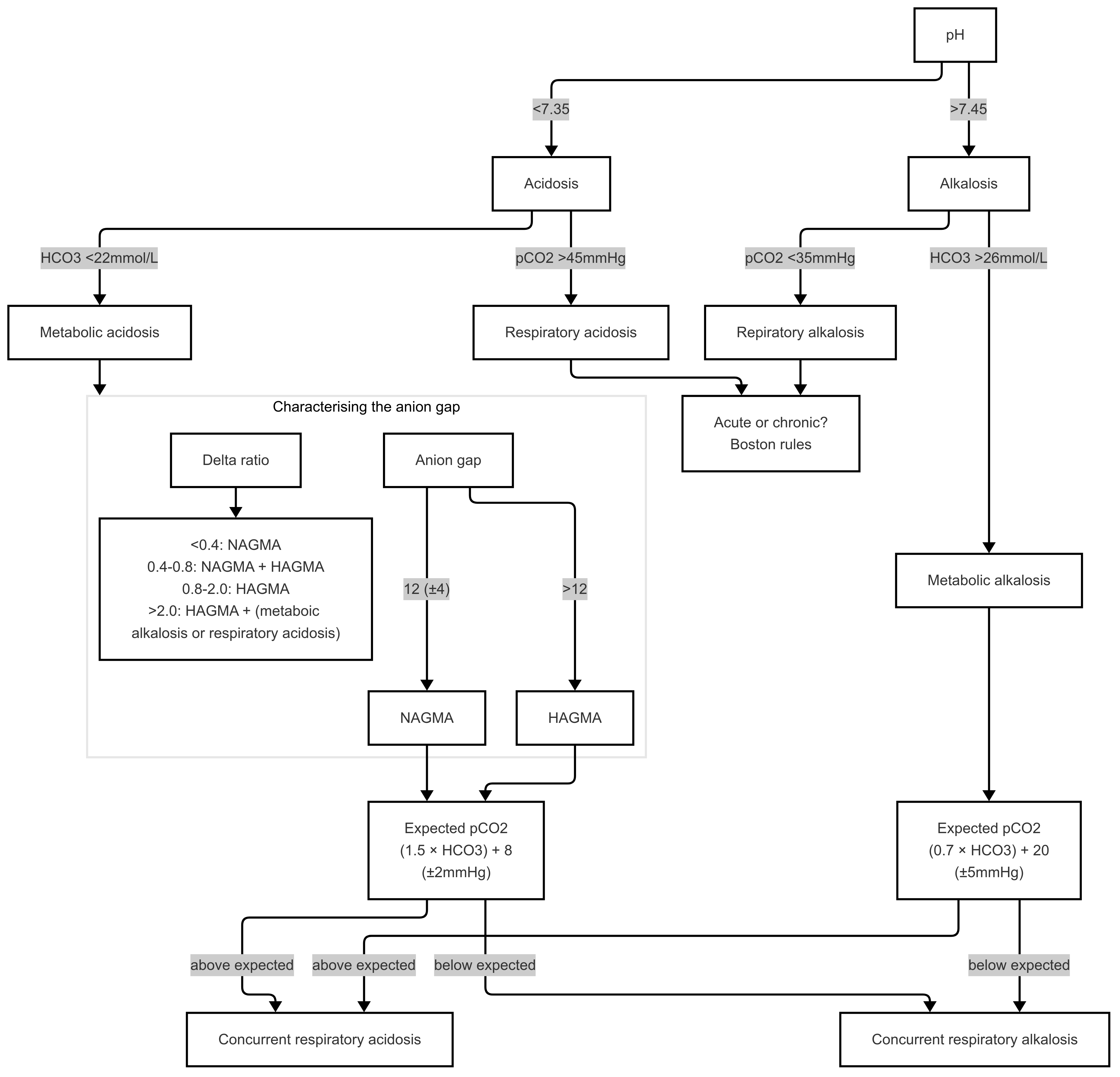 Is the patient acidotic or alkalotic. Normal is 7.35-7.45. The author wonders if, technically speaking, the pH may be normal in either condition, the normal pH just represents the absence of alkalaemia or acidaemia; or is it the other way around?